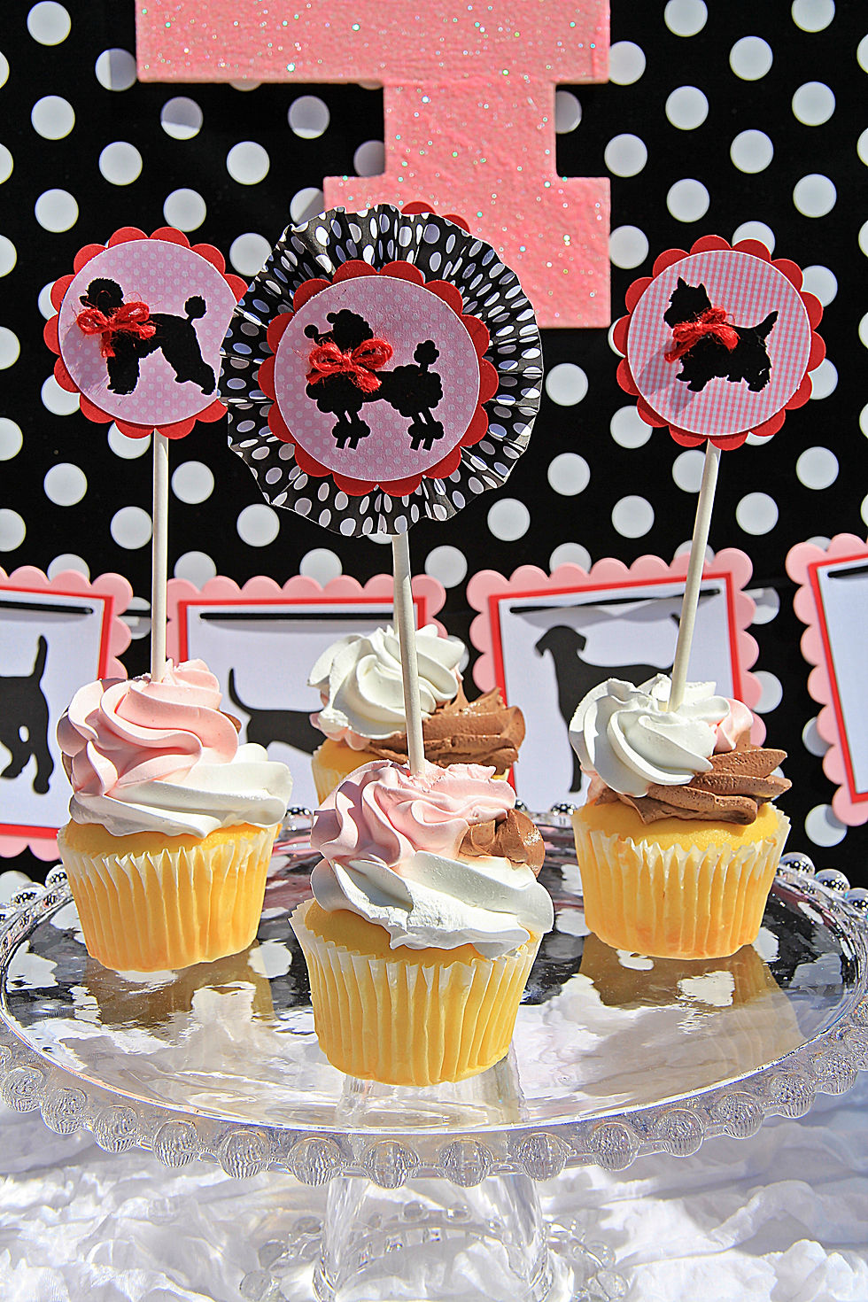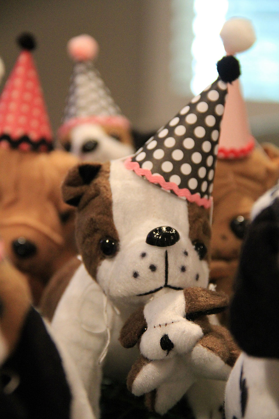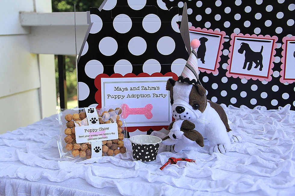 The puppy party was just perfect! I used pinks, blacks and reds to decorate. The guests adopted a puppy, added a dog collar and filled out an adoption certificate. The kids took the puppies to the vet, grooming station, and made a leash. I decorated the table with dog bowls to eat the cupcakes out of.